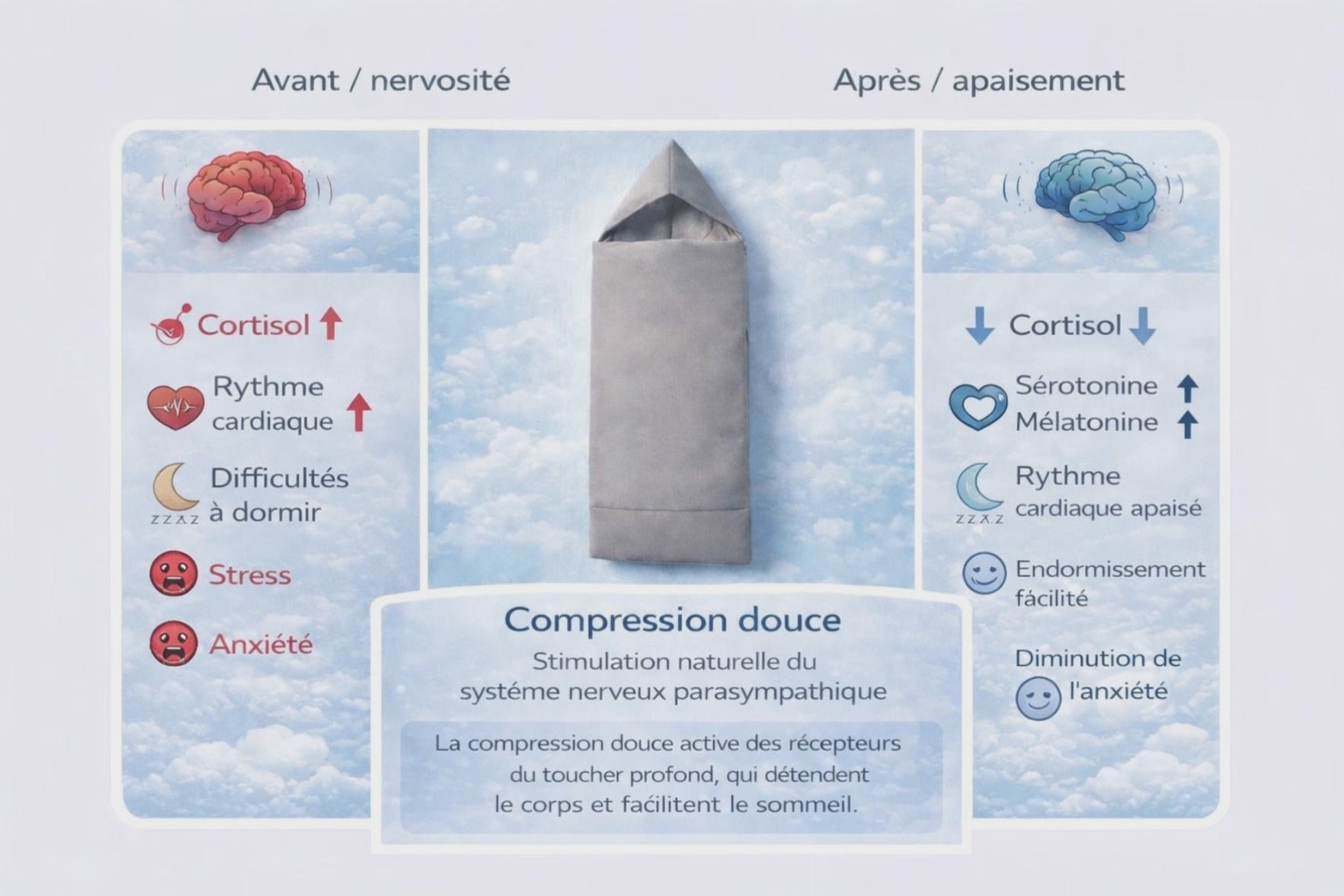 La couverture Cocon est née. une pression douce qui dit à votre système nerveux qu’il peut enfin relâcher. Comme un câlin qui dure toute la nuit.